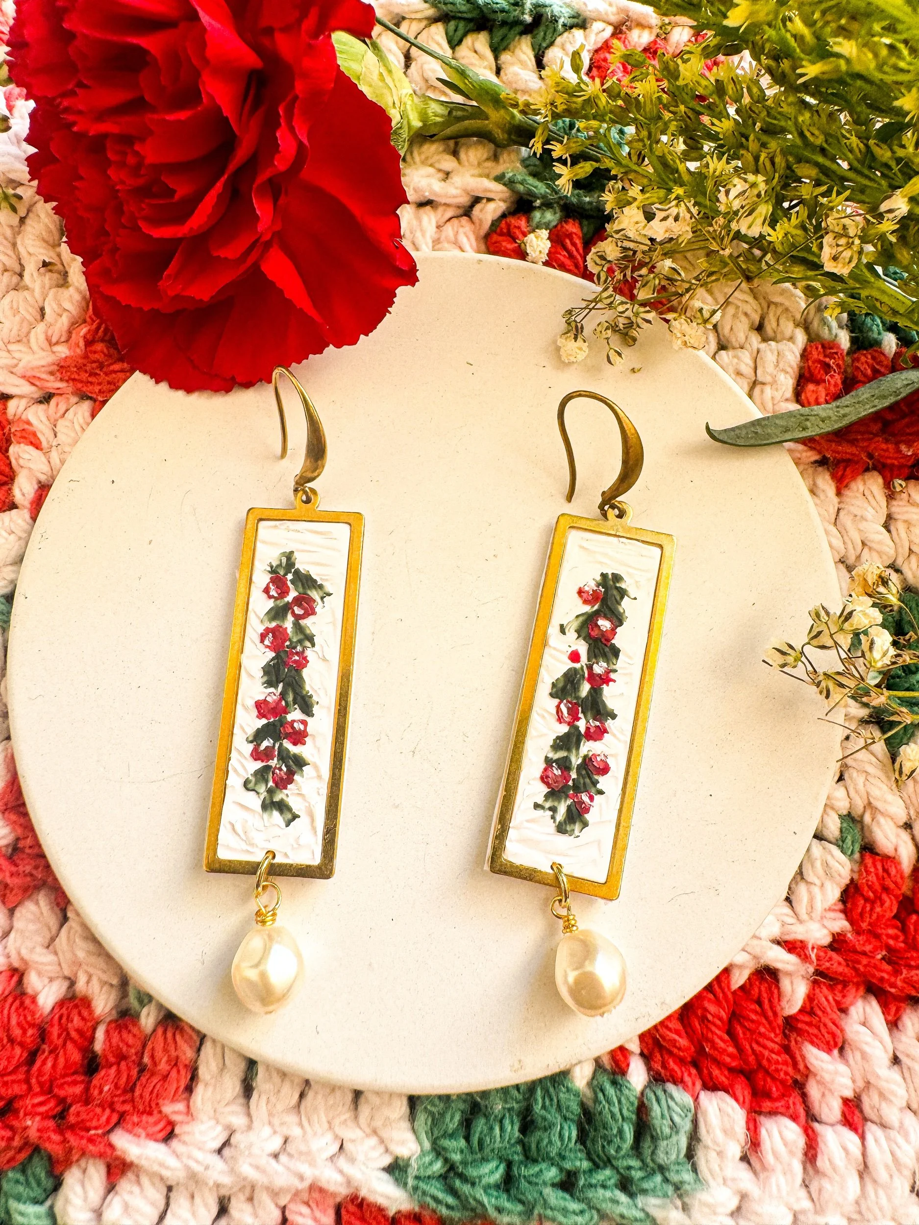 These earrings were created to look like a bunch of wispy holly berries and leaves painted on a canvas. They are enclosed in a brass rectangular frame and are complimented with a freshwater pearl to elevate the whole style. They perfectly go with any outfit.
